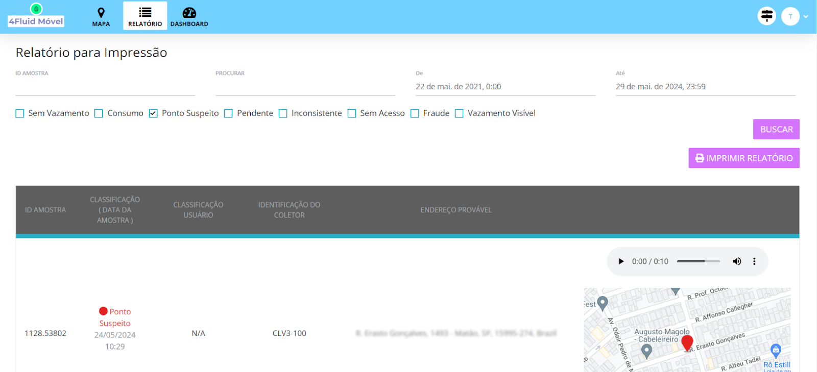2. Relatório dos pontos suspeitos que foram pesquisados com o aplicativo 4Fluid Inspeção.